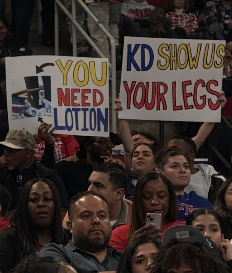 此役,火箭主场球迷举出牌子上写着:“KD,给我看看你的腿,你需要身体乳。”